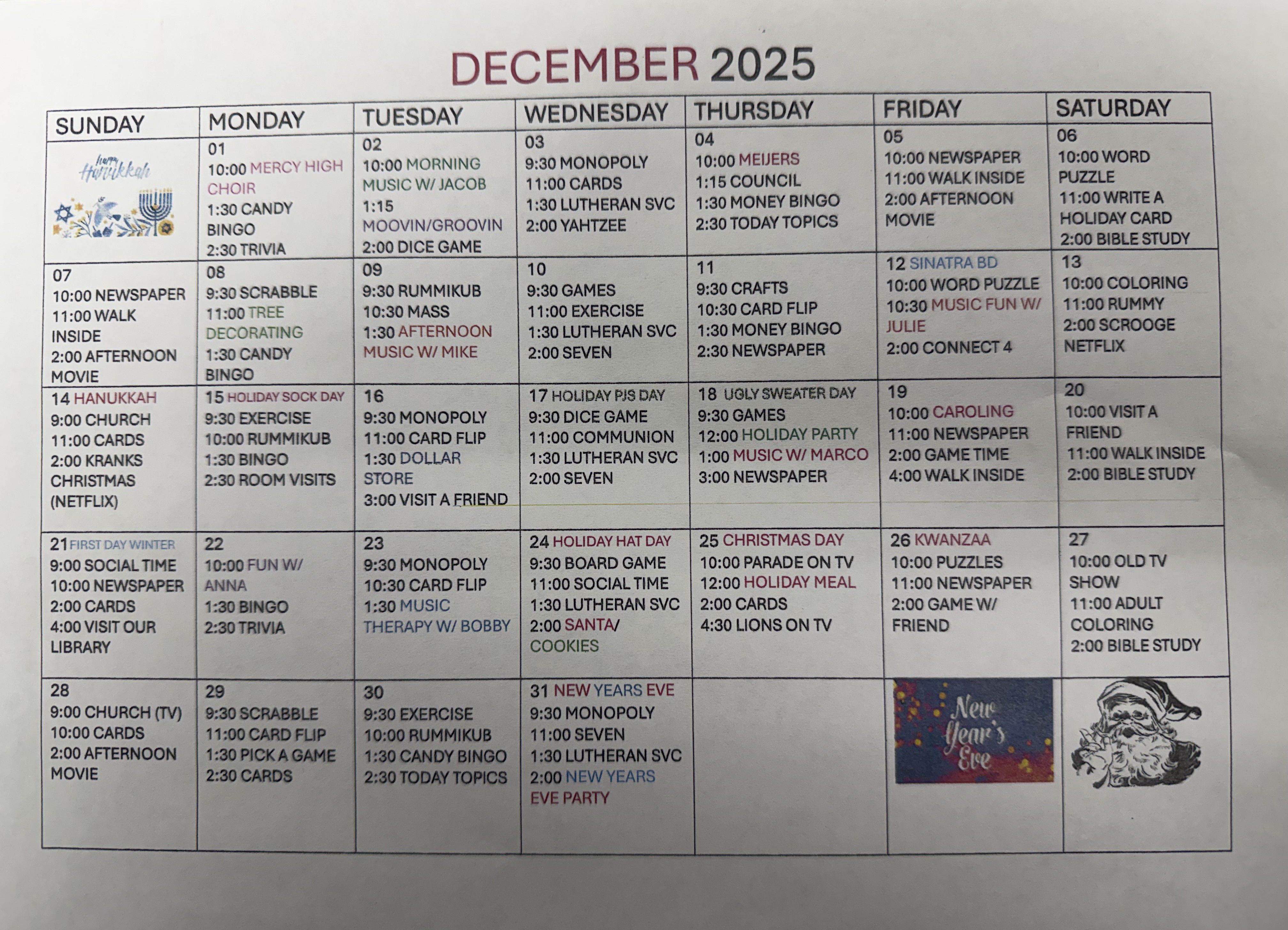 Our talented Activities Director encourages our residents to participate on a daily basis. Activities are summarized in our monthly newsletter and calendar.